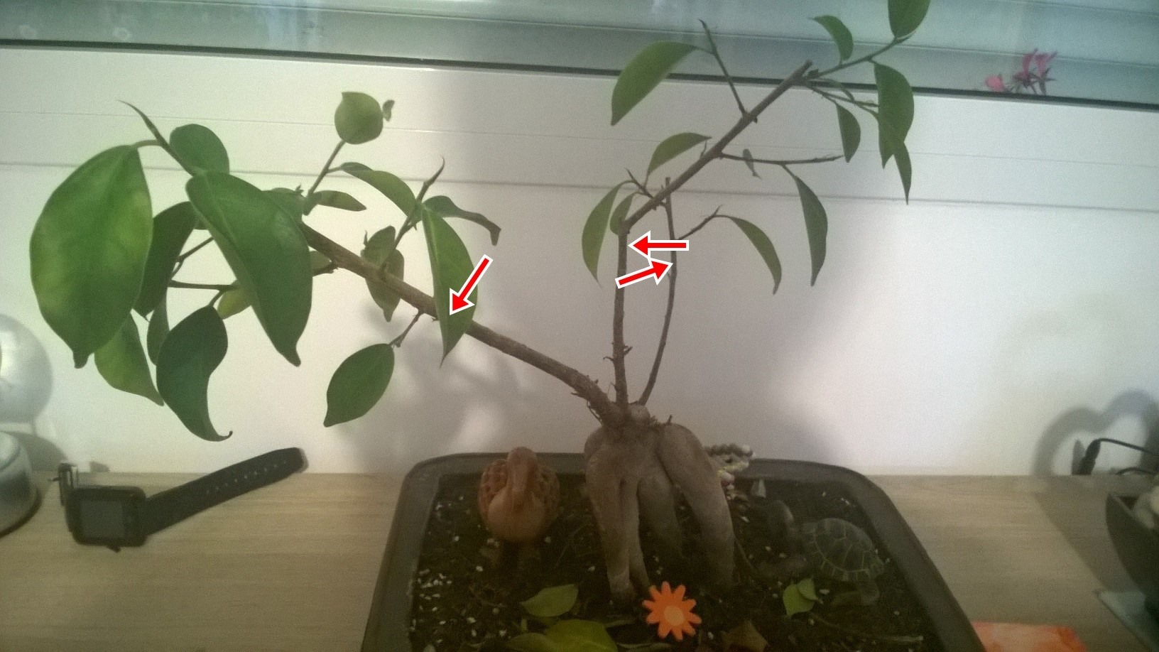 CAD, couper les branches que tu as marquées, sauf une, pour que ton ficus puisse continuer à "vivre": Tu couperas cette dernière branche lorsque les pousses issues de la première taille, auront des feuilles pour prendre la relève!