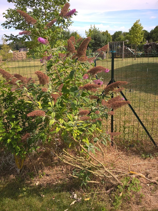 J'ai ce buddleia qui est assez abîmée et ne ressemble pas à grand chose. Nous avons enlevé toute une partie de l'arbuste où le bois était mort. Une autre partie a quand même fleuri.