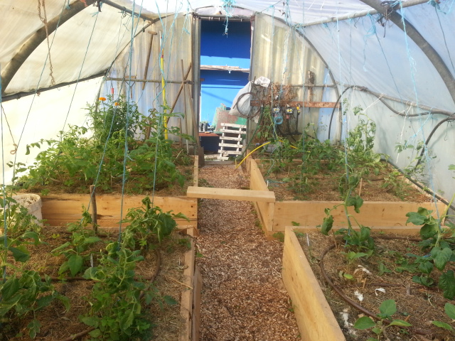 J'explique; après une absence d'un an, ma femme n'ayant jamais arrosé la serre (comme ul n'y avait "rien"), la terre s'est fortement minéralisée (traces de sels sur certain morceaux de terre., plus de végétation, le désert), j'ai essayé de rattraper le coup mais sans succès; une photo avant le grand chambardement en avril-mai:. on voit quelques taches devant le seau J'ai donc défoncé, amenné des débris et monté les parcs ainsi:buches pourries, écailles poulailier,terre (moitié celle de la serre et moitié du potager), branchettes, terre, brf, fumier bovin composté d'un an, terre, restes verts, terre, compost et tonte.