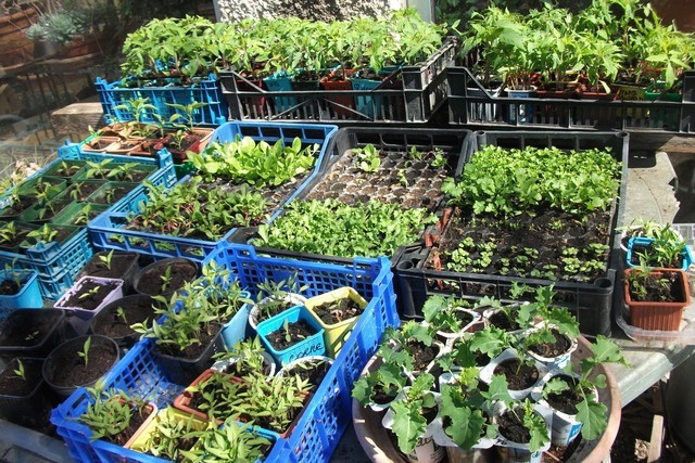 voici mes semis en avril au soleil rentrés le soir ds une serre froide