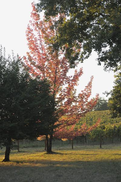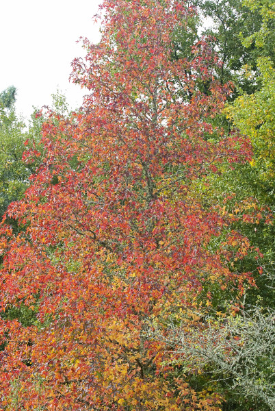 Le Liquidambar de mon voisin est sur un sol superficiellement acide actuellement extrèmement sec, le dessous est profondément calcaire voire impénétrable, de plus il est exposé à tous les vents. Il est depuis trois jours complètement flamboyant alors que le-mien (du même âge et de la même espèce) est encore complètement vert. Et tous les ans c'est le même petit décalage plus ou moins prononcé... ça tient à pas grand chose , j'apprécie ce presque rien , ces nuances qui s'échelonnent disent que rien n'est jamais pareil; plus j'avance en âge plus je les apprécie,