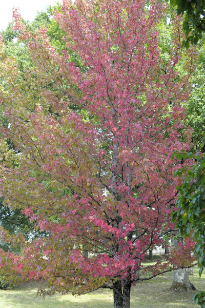 Styraciflua dont nous parlons est l'une de ces espèces + ses variétés, donné pour 12 m , port colonaire +/- large. Le-mien , photo précédente, a 35 ans et couvre 5 m de large, un enfant peut sans peine entourer le tronc de ses bras et même il lui reste les mains !