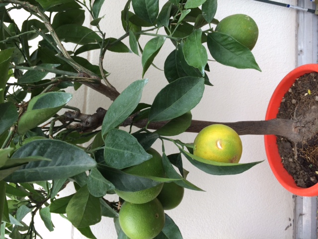 J'ai une orange qui commence à prendre une teinte claire (vers le orange) mais c'est la seule et je ne sais pas trop quand les fruits sont sensés changer de couleur. Je ne sais pas pourquoi mais je sens que ce frit là n'ira pas au bout de sa croissance..