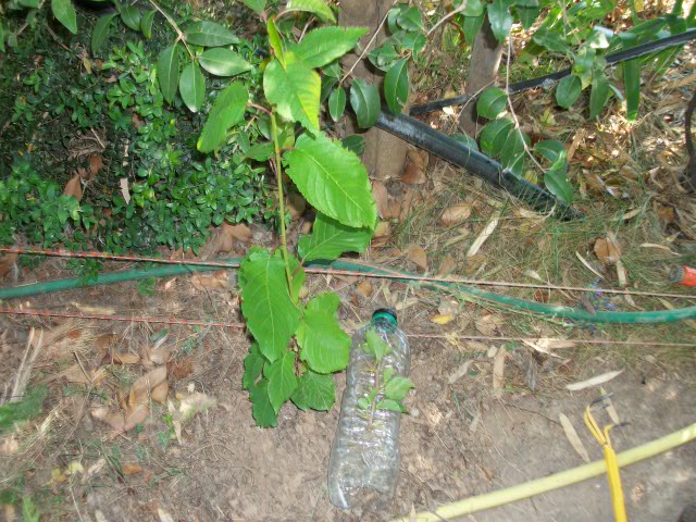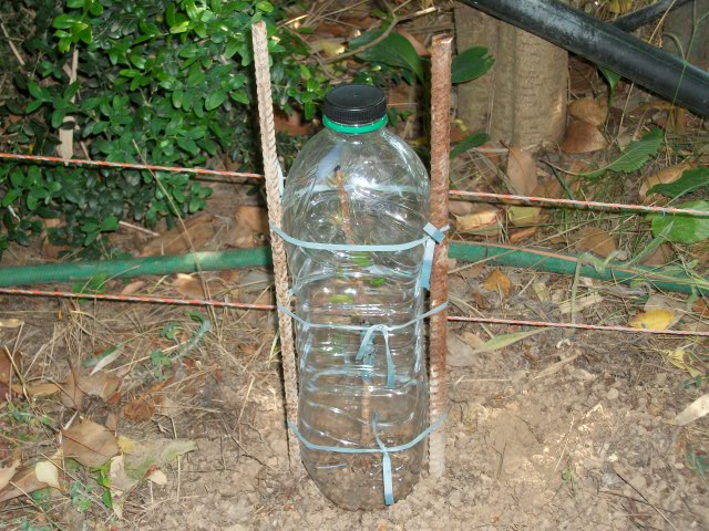 J'essaie une méthode de greffe en fente pleine, mastic goudron de Norvège, ligature élastique avec confinement humide dans bouteille en plastique.