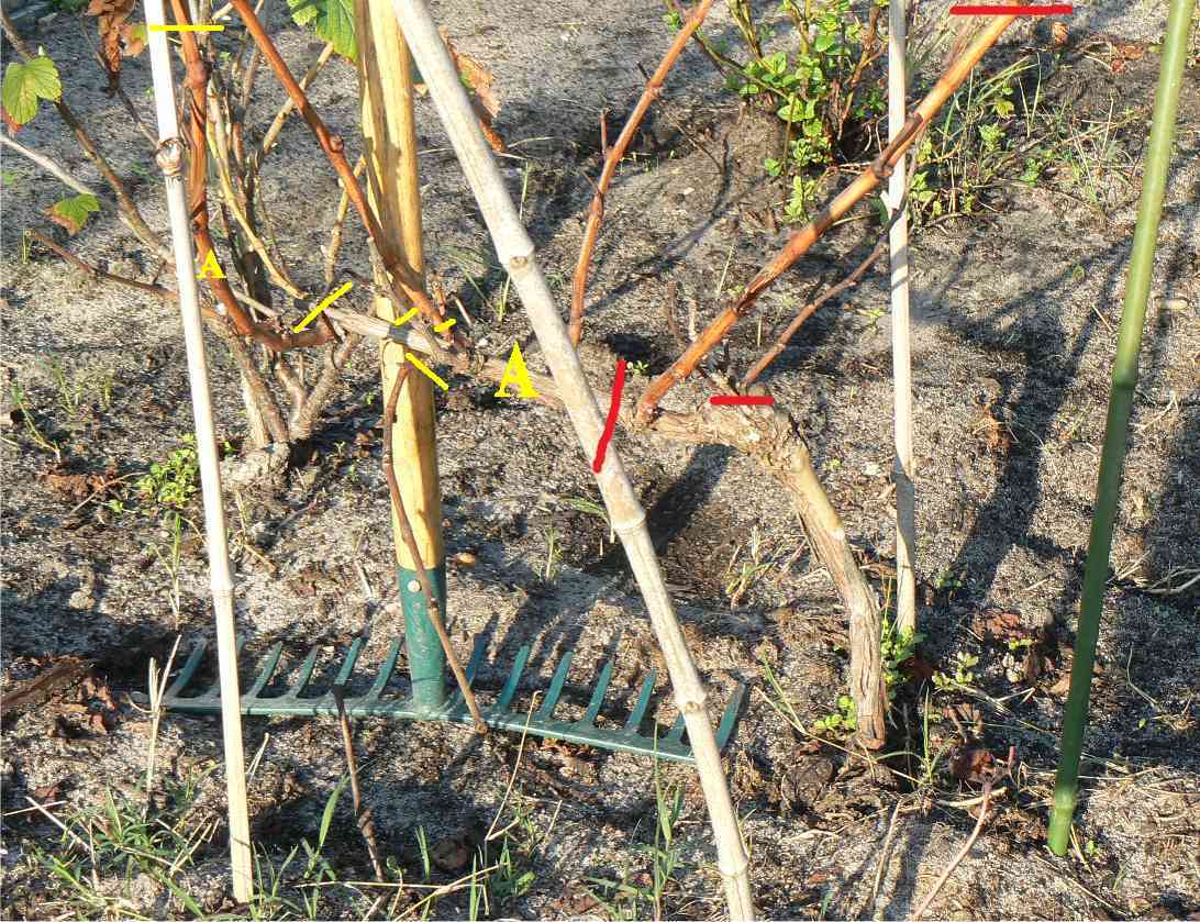 Concernant cette première, je te fais entièrement confiance, mais il ne vaudrait pas mieux la tailler comme sur la photo en gardant en plus la suite du tronc (A) et un sarment de plus (A) ? Une dernière question: est que je peux la tailler déjà ?