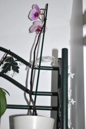 État actuel de l’orchidée : Plus de feuilles, juste une tige encore bien robuste avec quelques fleurs qui tiennent le coup mais sûrement pas pour très longtemps.