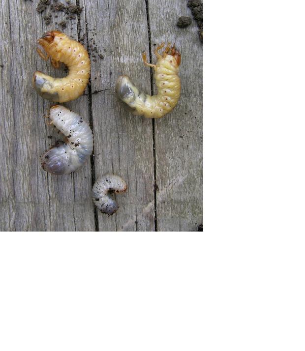 Hanneton (mange les racines): grosse tête, longues pattes, extrémité d'abdomen plus fine, jaunâtre.