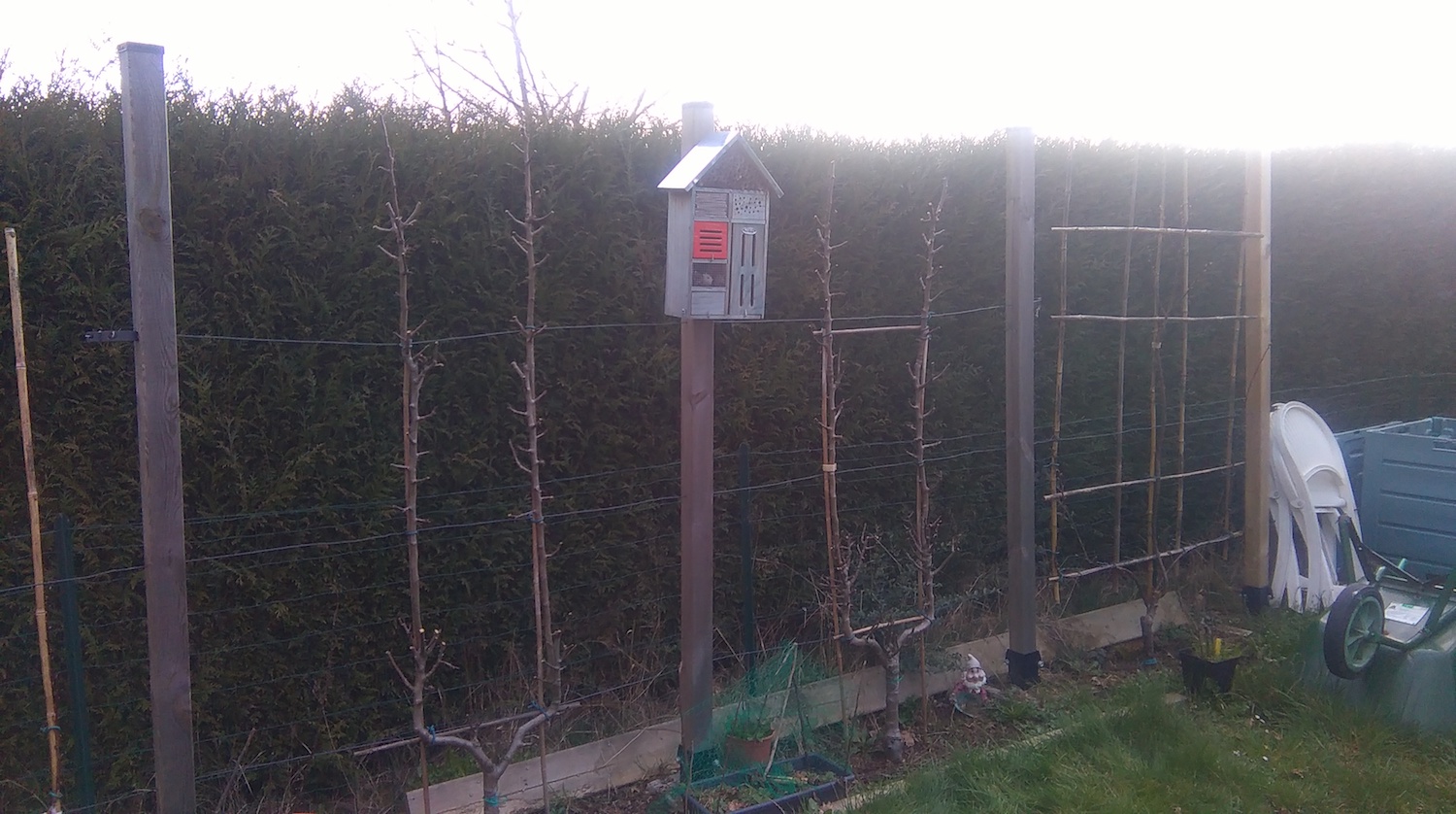 Par contre je n'hésiterai pas à rabattre la hauteur soit d'une 30aine de cm, ou même plus jusqu'au fil du haut (base de l’hôtel à insecte)en taillant juste au dessus d'un départ multiple de branches. Cela afin de favoriser la formation de dards et d'organes fructifère comme l'a expliqué Opusoculi.