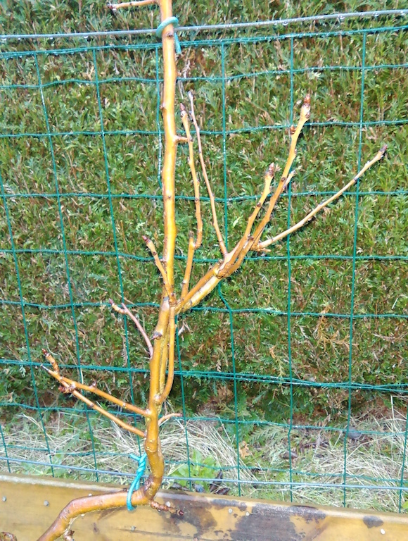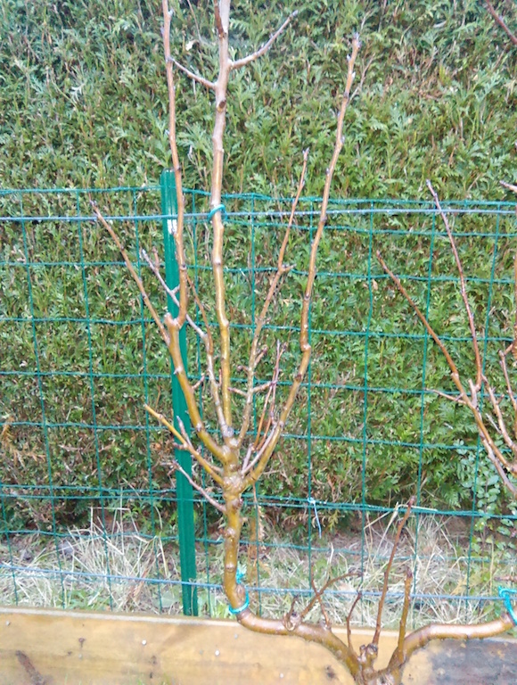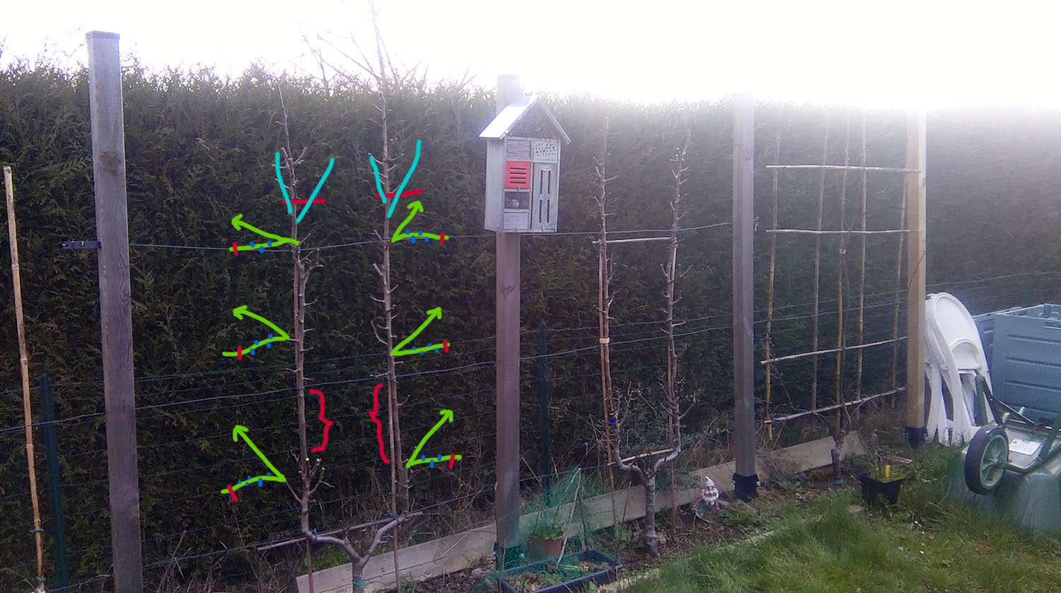 En fin d'été, incliner à l'horizontale ces prolongements. En hiver, épointer la tige. J'ai marqué en bleu foncé les futurs dards qui apparaitront l'année prochaine.