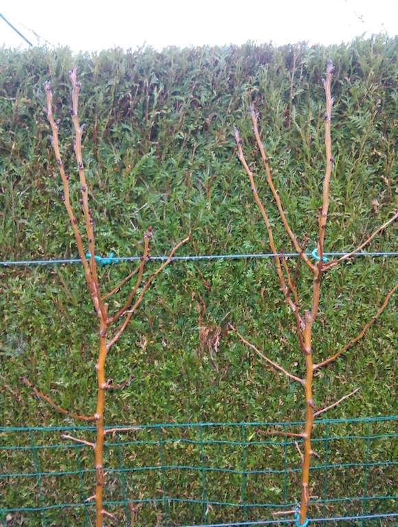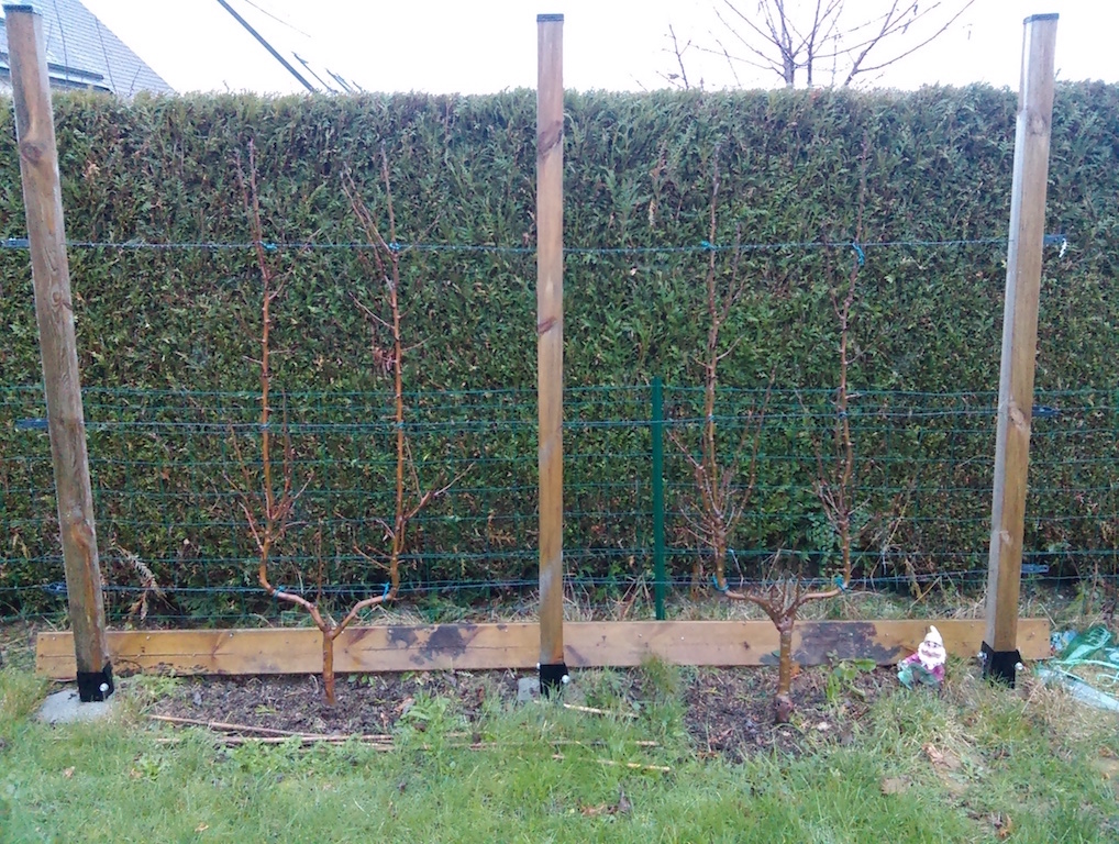 Il me semble que la situation contre une haie de résineux sera un problème à long terme à cause de la concurrence des racines . Le manque de lumière sur un côté peut être géré puisque ce sont des palmettes, mais tes arbres auront toujours tendance à monter pour chercher le maximum de lumière au dessus de la haie. Tu sera donc obligé de tailler souvent le haut et même en cours de saison en pinçant les terminaisons en vert.