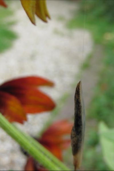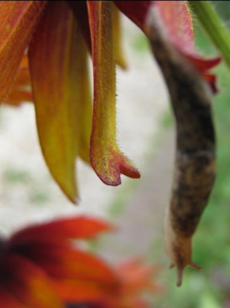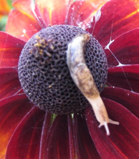 J'ai posé une limace sur un Rudbeckia poussant dans un grand pot donc pour être à bonne hauteur, puis après essuyage des mains j'ai commencé à photographier. J'ai fait un nouvel essai et j'ai même changé de limace. Et à chaque fois, voilà ce qui s'est passé en moins de deux minutes (bien regarder le fil de mucus) :