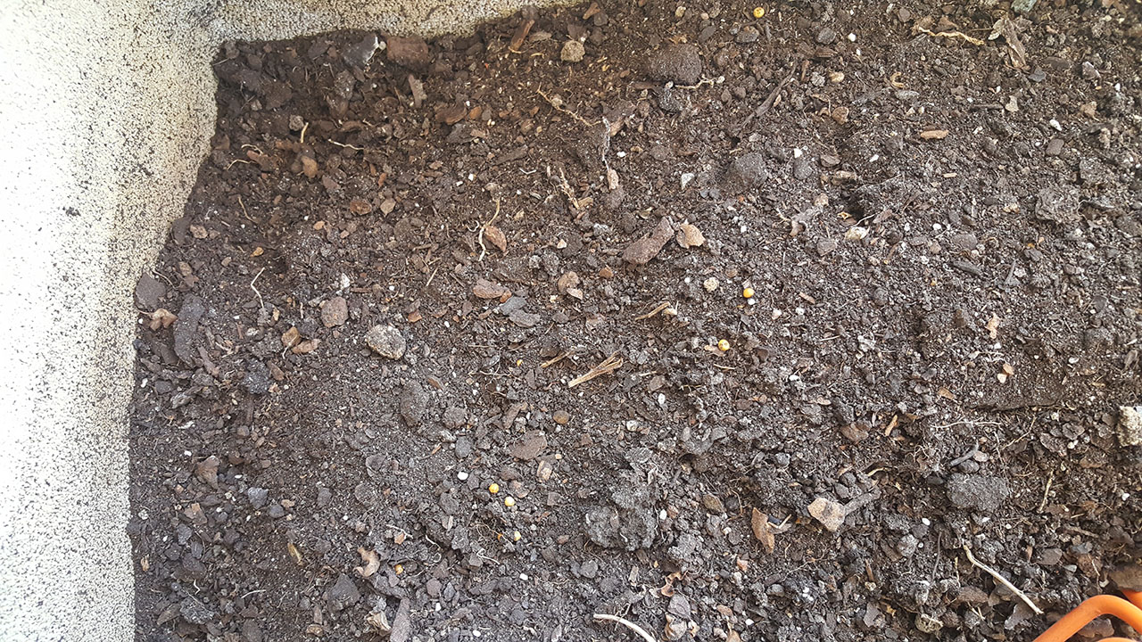 Tout d'abord, de la terre est déjà présente dans ces jardinières mais elle me semble peu utilisable dans son état actuel. En effet, elle est plutôt très sèche et parsemée de petits déchets minéraux/végétaux. J'ai pu localiser une couche de gravier au fond donc un drainage est déjà présent.