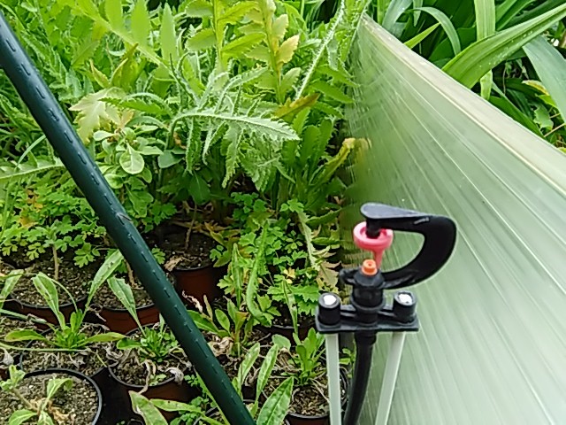 j'utiliserais plutôt des micro asperseurs plaçés sur le pourtour extérieur (ça devrait le faire avec trois)