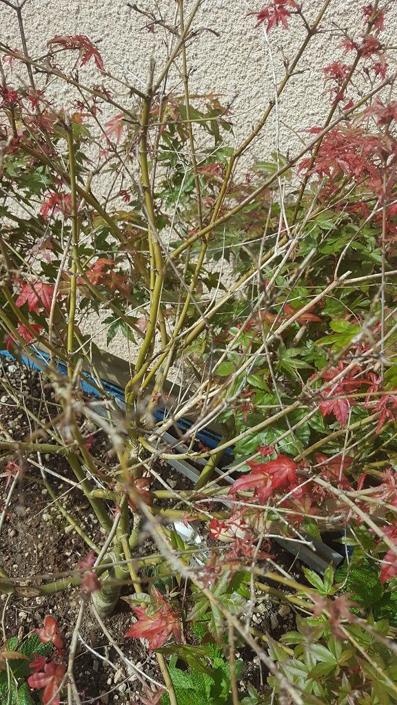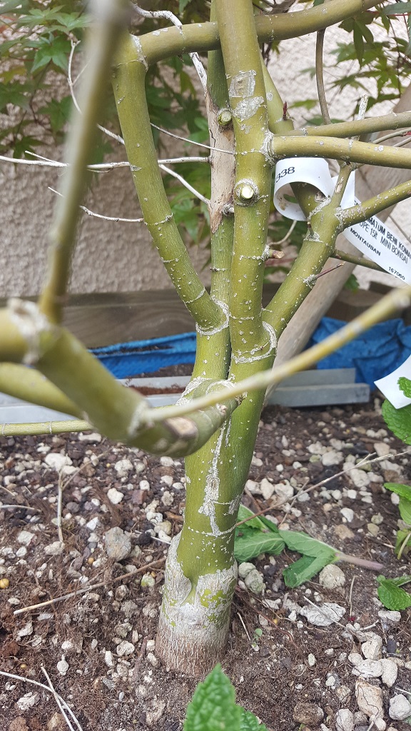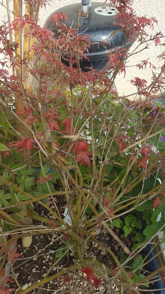 Donc je fais une nouvelle hypothèse: il pourrait s'agir d'une 'reversion' = une partie des branches du greffon fait un retour à un état antérieur de la plante et se mettent à ressembler à un palmatum type.