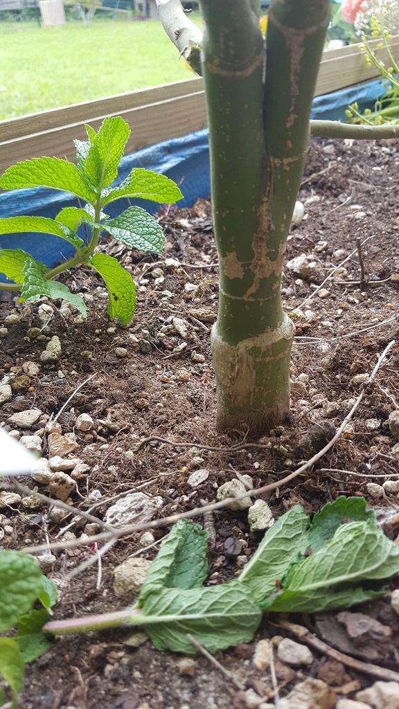 Le collet, la greffe, le départ du tronc sont en bon état. Sur une branche , il y a une tache grise (on dit "nécrose"). S'est une partie de bois mort mais qui ne semble pas témoigner d'une maladie qui se développe, à mon avis c'est circonscrit.