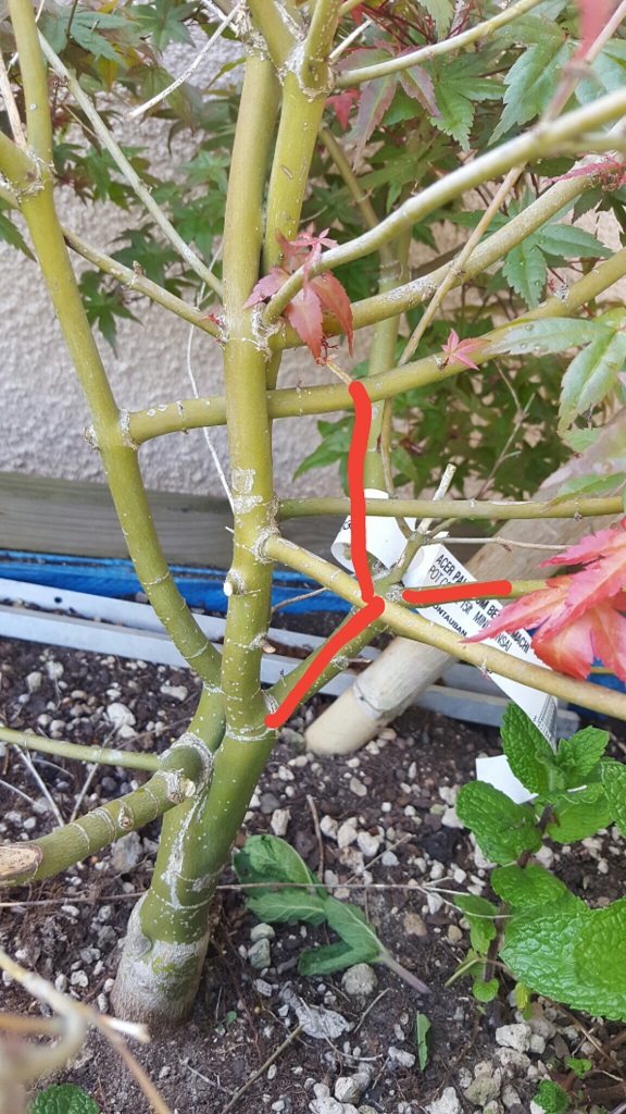 De plus au niveau du tronc, une seule ramification soutient toutes les branches développées. En rouge sur la photo.