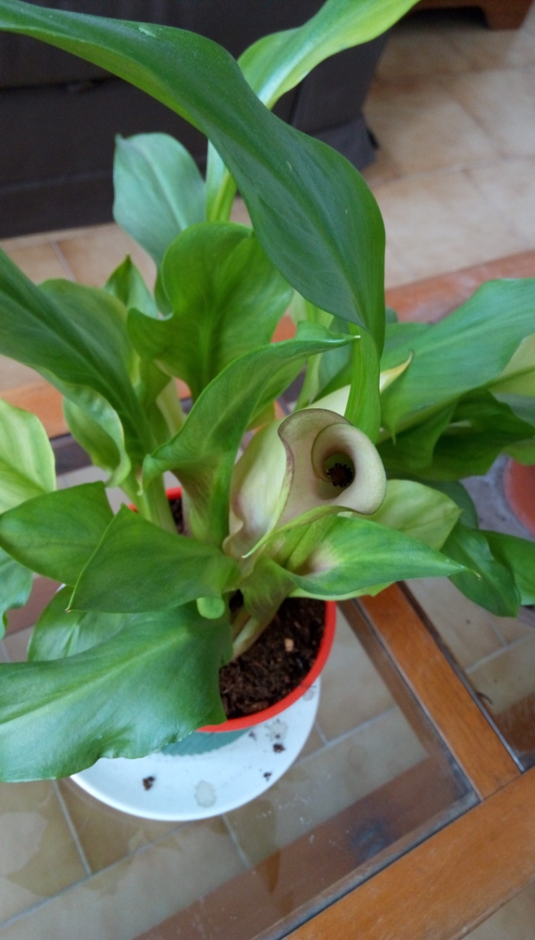 Mais j'ai vu que certains Zantedeschia avaient des taches blanches sur les feuilles et le mien n'en a pas, aussi il fait des fleures plus "en tube". J'espère que ce n'est pas qu'il manque de quelque chose! De lumière peut être? Ou peut être que c'est normal, je ne sais pas...