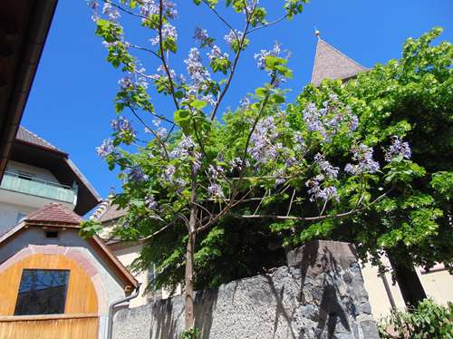 Dans la petite ville de Burkheim , on a été très intrigués par un arbre à fleurs bleues dans une propriété.