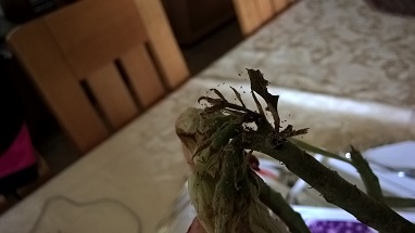 Bonjour à tous. Mon adenium acheté récemment était magnifique avec une dizaine de fleurs et en quelques jours, il a complétement dépéri. Il ne reste plus aucune fleur et presque toutes les feuilles sont tombées. En regardant de plus près, j'y ai vu de minuscules insectes (araignées?) blancs faisant des fils. Cela ne ressemble pas à la cochenille. Je l'ai déterré pour examiner les racines mais elles sont saines. je l'ai rempoté et nettoyé chaque tige/ feuille au coton tige avec un mélange eau+savon noir. J'ai peur qu'elle ne soit fichue. Quelqu'un peut-il m'aider?