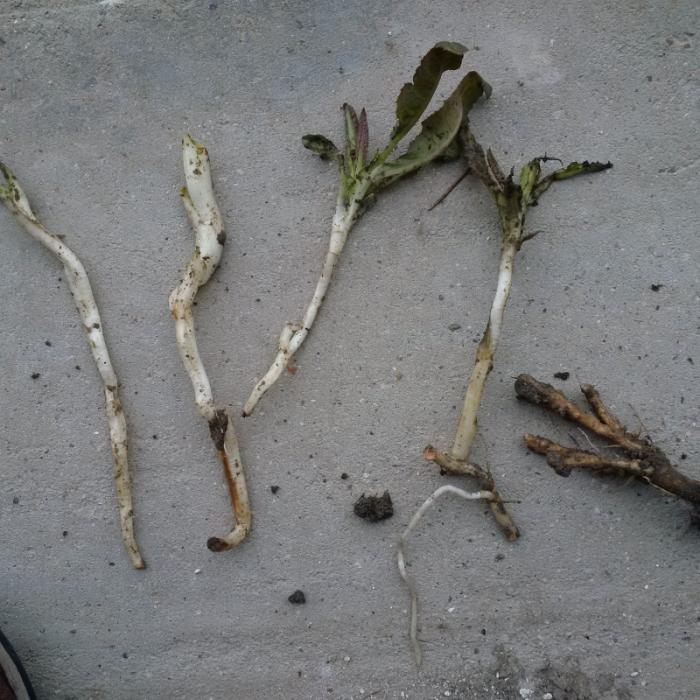 Elle a un corps blanc, parfois profond de plusieurs dizaines de centimètre. Une racine parfois beige surmonté de plusieurs pousse dessus. Le moindre morceau oublié se transforme en une nouvelle mauvaise herbe.