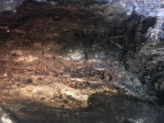 A l'intérieur, on trouve des déjections marrons , collées au tronc, ainsi qu'au pied de l'arbre.