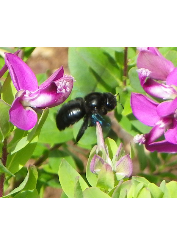 Depuis quelques jours cette bestiole rend visite à mon parterre et ne va que sur mon polygalia myrtifolia.Il a l'aspect d'un bourdon avec des ailes bleues !!!