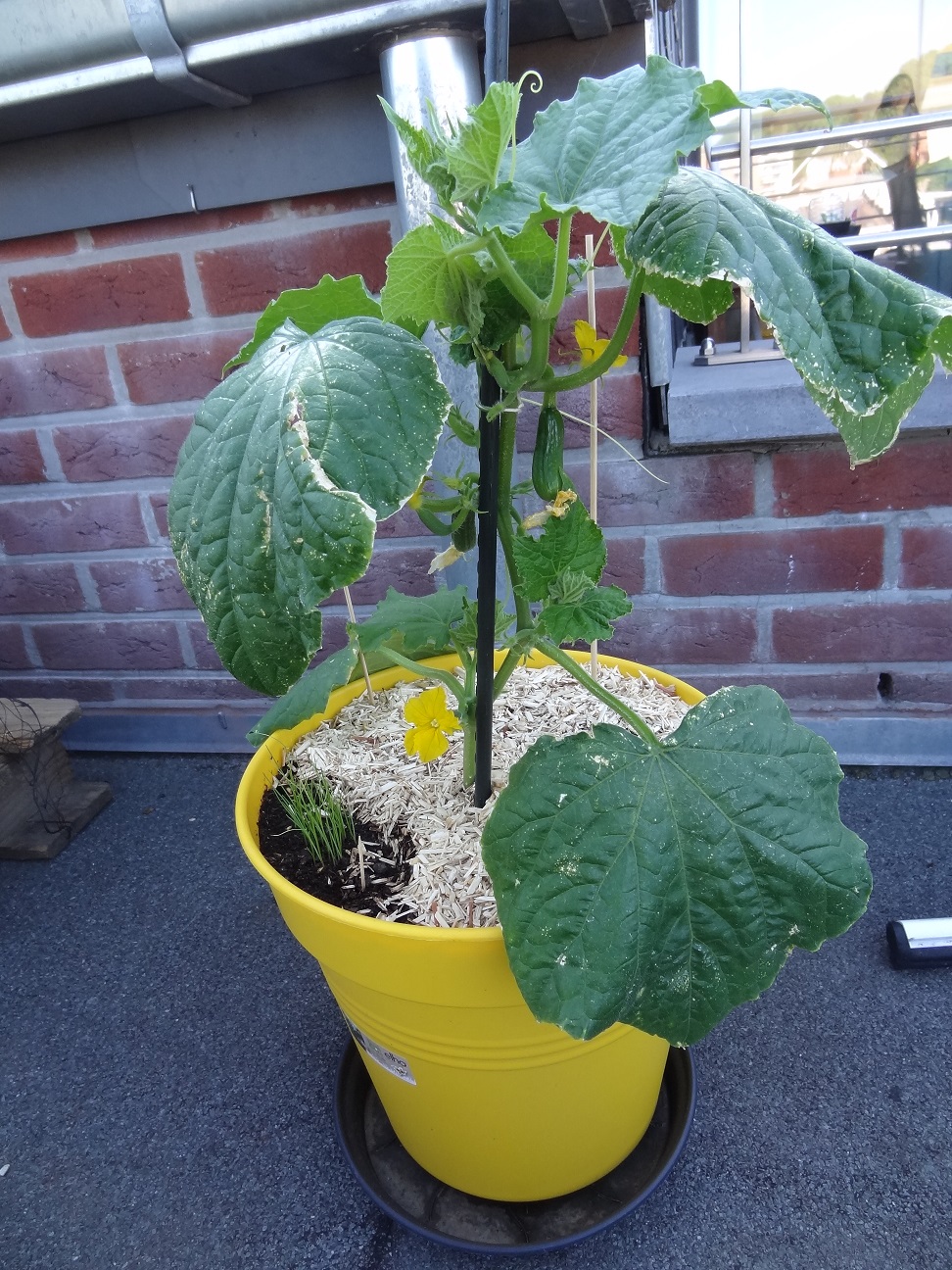 Pour la brûlure, d'accord avec Singha. Pour le nombre de concombre aussi, un concombre pollinisé grossit très rapidement, on voit la différence en une journée. Par principe, pour la cucurbitacées, je fais confiance à la plante, je ne retire donc rien et je ne taille pas.