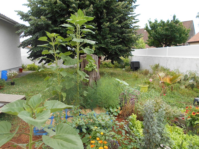 les semis spontanés de tournesols géants sont vraiment géants (environ 3 mètres).