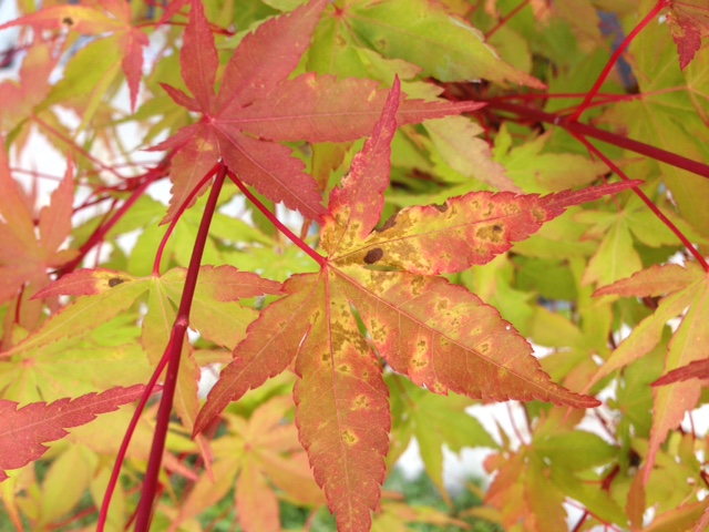 Depuis quelques jours j'observe des taches brunes qui se forment sur les feuilles de mon érable du japon (sango kaku).
