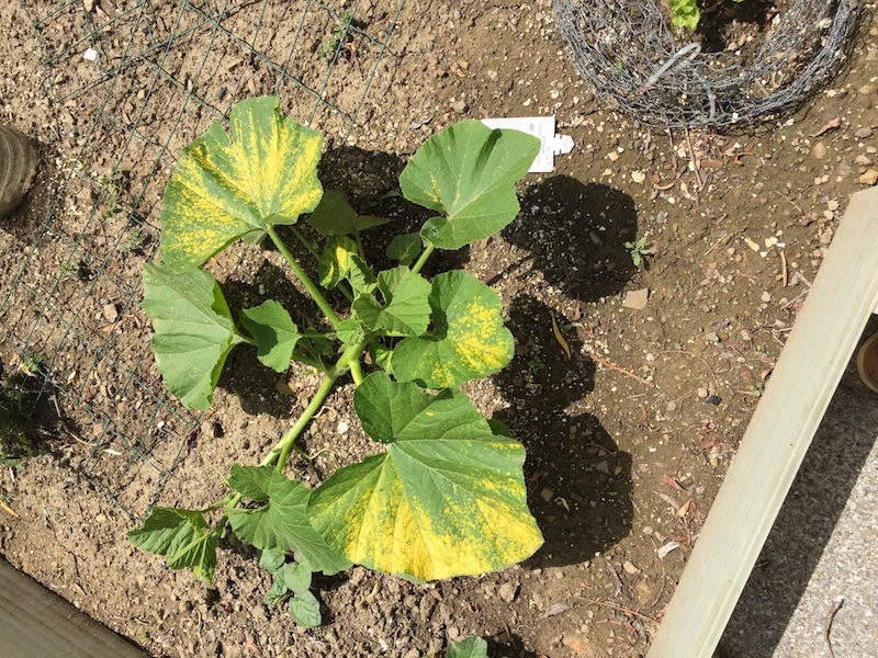 Je pense comme Singha, un manque de nourriture. Les cucurbitacées sont très gourmandes et un peu de compost est insuffisant. Pour moi, ce n'est pas un début de mildiou. Il est plus rare sur les cucurbitacées et se manifeste par des tâches comme on voit là :