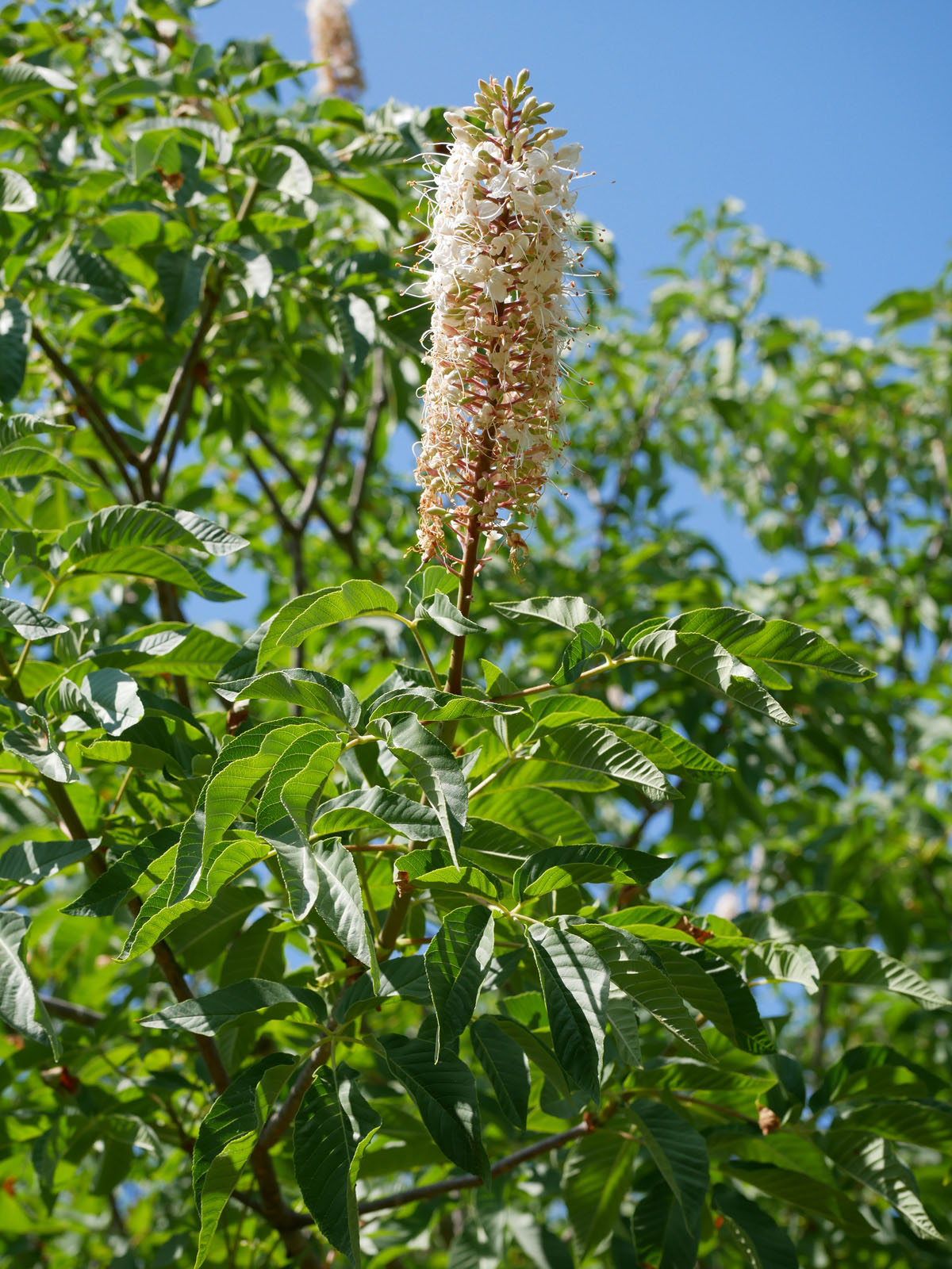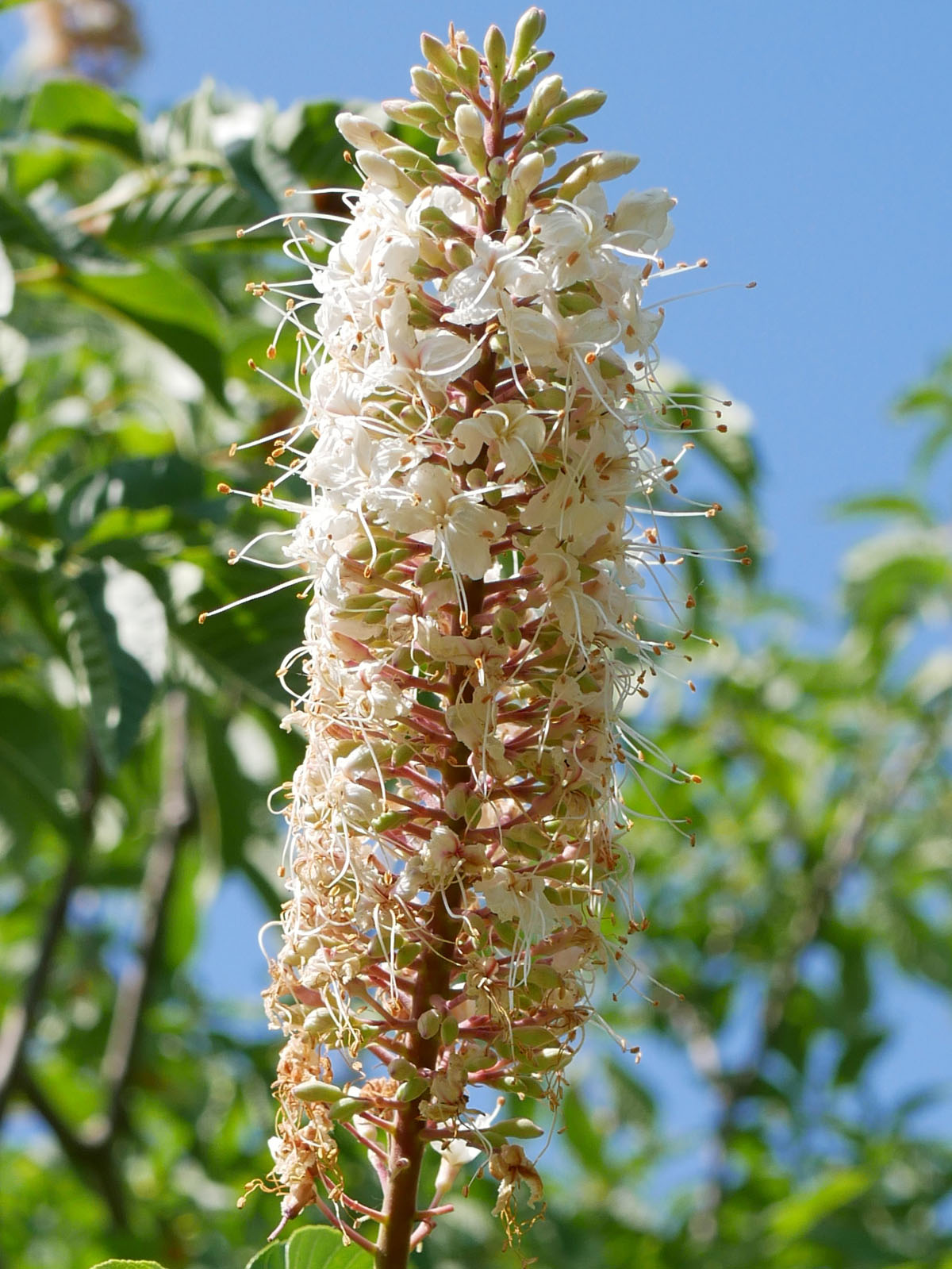 Cela me fait plus penser à un aesculus par exemple parviflora, feuilles palmées et fleurs à longues étamines.