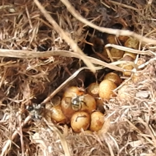Bonjour, hier en retirant des sacs remplis de choses à emmener à la déchetterie contre mon mur de maison ), nous sommes tombés sur des tas de grosses araignées, normal. Puis je me suis mise à dégager de vielles jardinières, elles même habitées, mais ce qui m'a fait littéralement tomber en arrière de peur est en soulevant un dessous de jardinière en plastique je suis tombée sur ce qui ressemblent à des abeilles. ..mais avec des oeufs comme posés dans un nid au milieu de l'herbe séchée. J'avais remarqué que quelques uns de ces trucs volants servaient de déjeuner aux araignées puisque entourées dans un cocon.