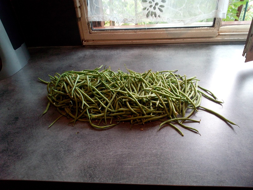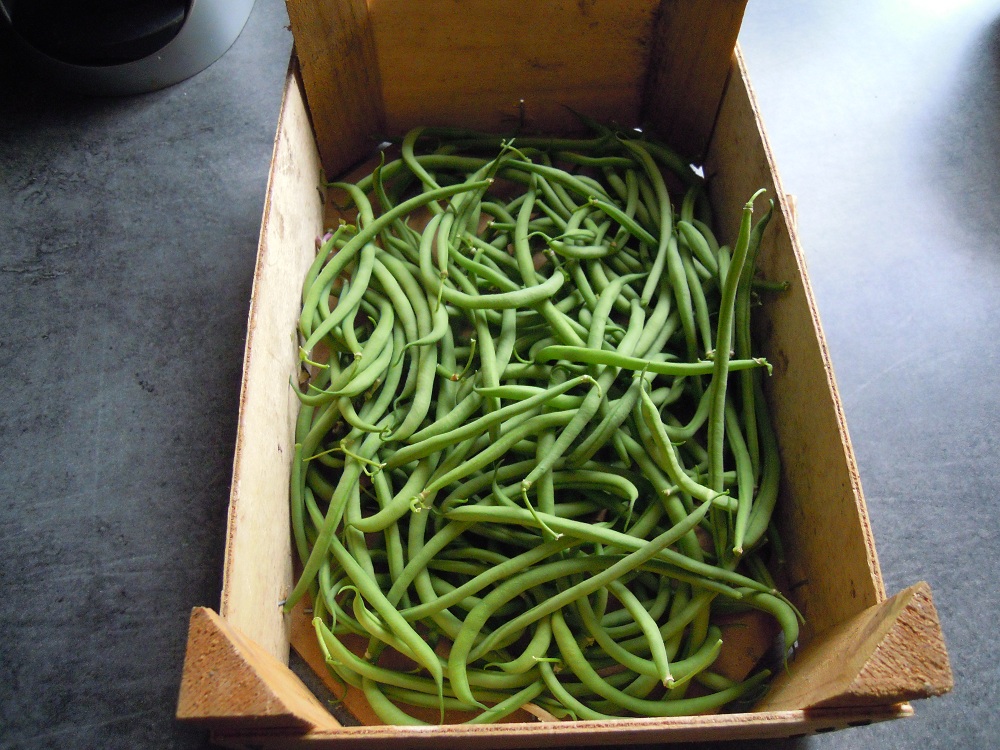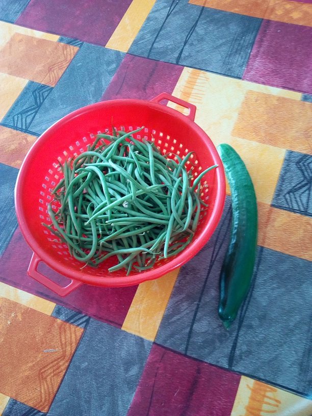De retour après 10 jours de vacances, le potager m'a fait un cadeau de bienvenue. J'ai fait des conserves de sauces tomate et de tomates au naturel, les soupes de courgettes en bouteilles suivront. En attendant, concombre tomates et haricots verts à tous les repas. Et cette tomate qui sera je pense la plus grosse en 2017 est finalement bien loin du kilo... Hier nous avons eu de très fortes averses de pluies et il est prévu encore de l'humidité pour la fin de la semaine, les tomates seront donc légèrement teintée de bleu en fin d'après-midi. Les cucurbitacées ont été soufrées, l’oïdium a profité de mon absence pour s'inviter, les concombres sont très touchés, on verra si on peut sauver un ou deux pieds...