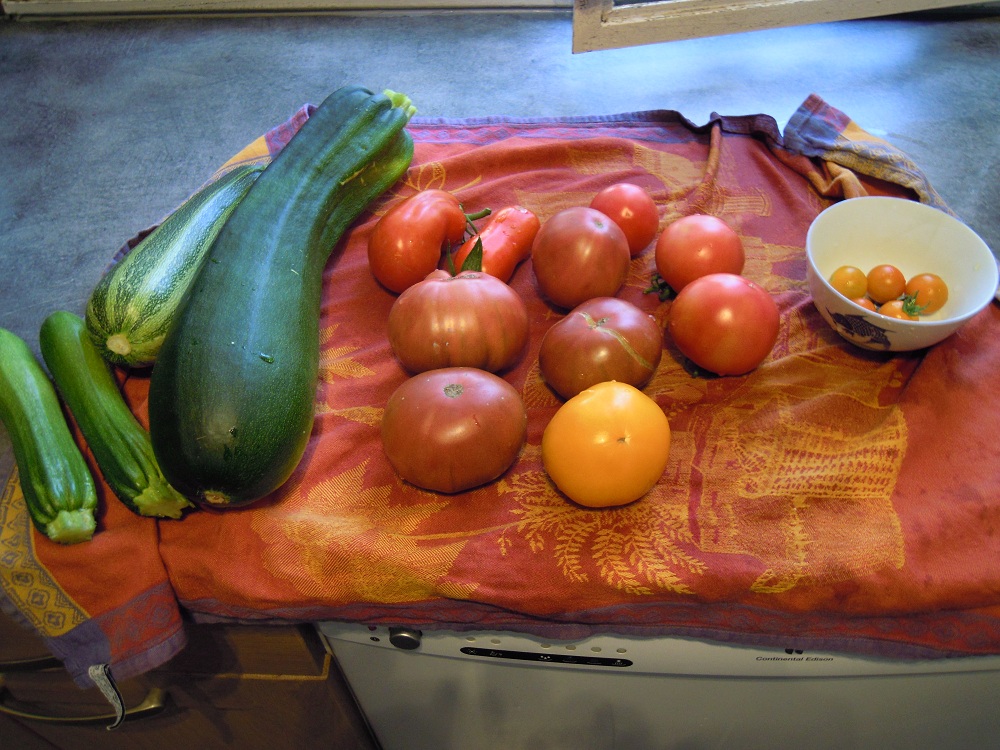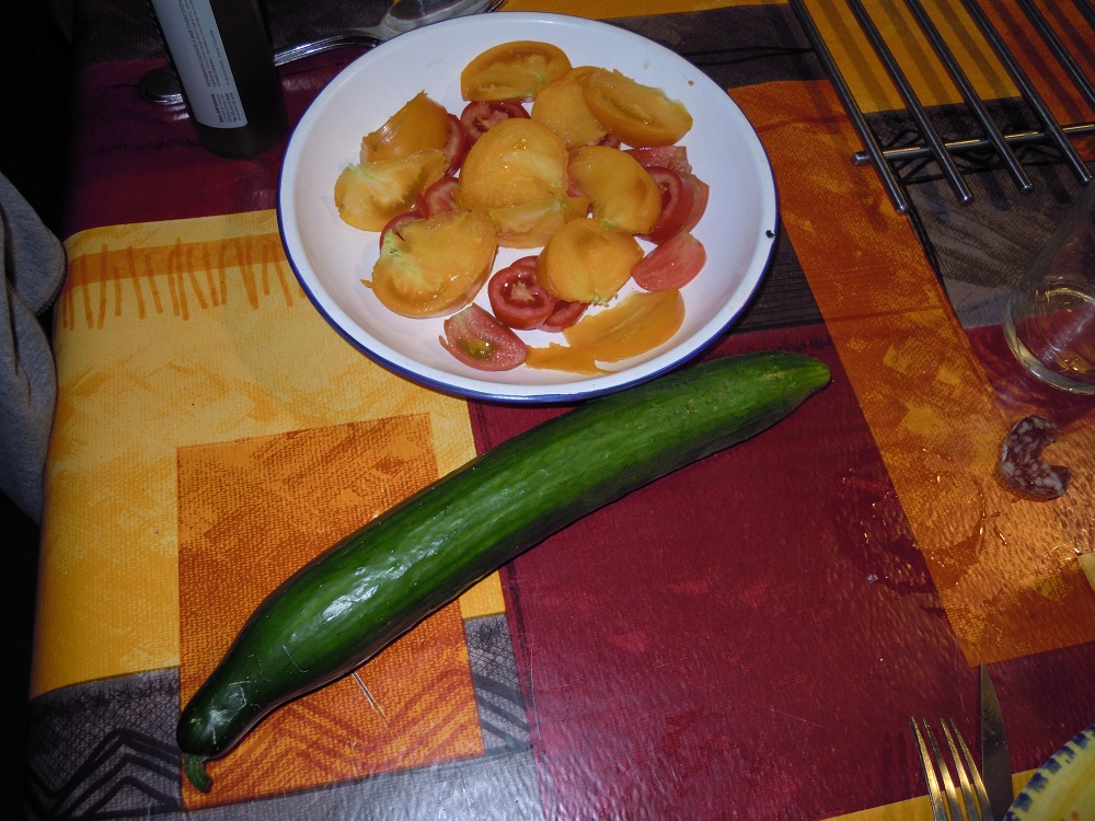 Hier soir première vrai récolte de tomates et je me suis fait surprendre par une courgette que je n'avais pas vu.