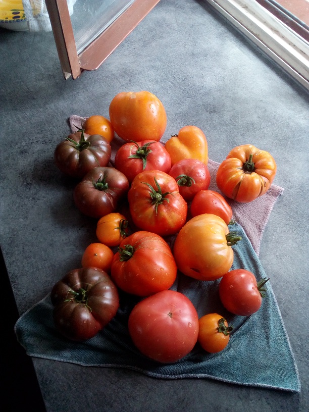 Récoltes d'hier soir 3 noires inconnues, une ananas, 4 roses de berne, 3 jaunes inconnues, 2 rouge inconnues de Dordogne, 4 OR 117 et une dont j'ignore l'origine, le plant a été vendu à un ami comme une cœur de bœuf et je suppose qu'il s'agit d'une F1 qui n'a rien à voir avec CDB : Je me rend compte que ça fait beaucoup d'inconnues tout ça...