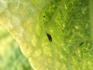 Sous la feuille, on trouve de minuscules toiles, mais aucune araignée ou acarien ... mais de nombreuses larves noires de 2 mm avec de petites pattes dans les toiles (et vivantes!)