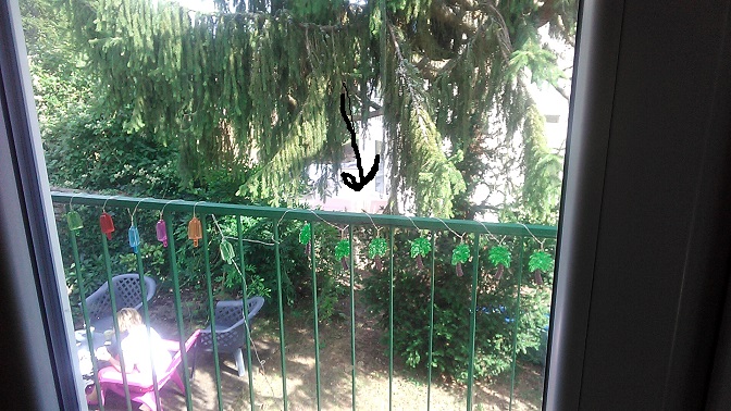 En PJ vu du balcon, sur la gauche de la photo, la glycine (oui on voit pas bien), la flèche indique le trou où se trouve le jaccuzi du voisin et où on veut mettre la "cloture"