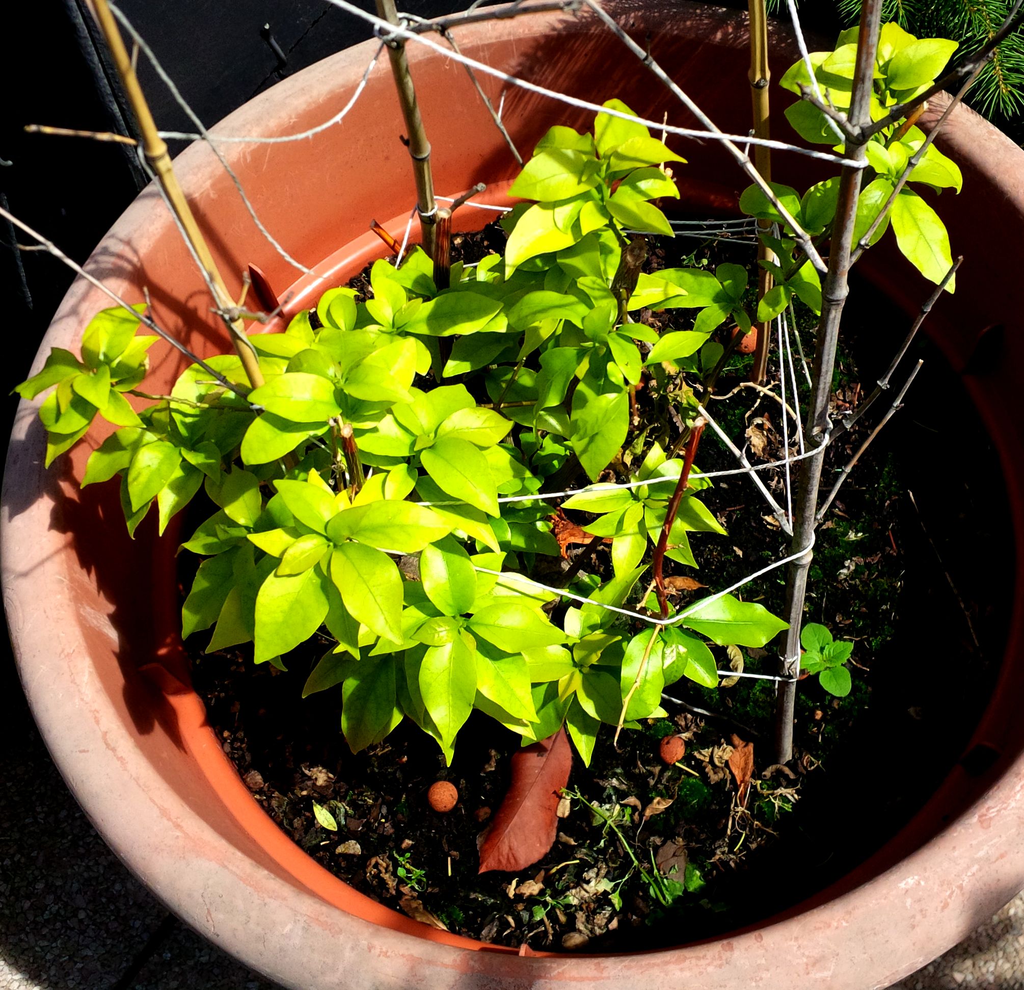 Quoiqu'il en soit il a perdu ses quelques feuilles. Mais aux beaux jours il a fait des bourgeons qui se sont éclos. MAIS, il ne pousse pas vraiment (quelques feuilles vertes), car il végète puisque les feuilles sorties sont restées au même état: voir photo ci-dessous. Et il est dans cet état depuis Avril.