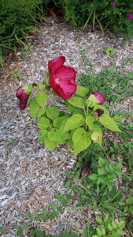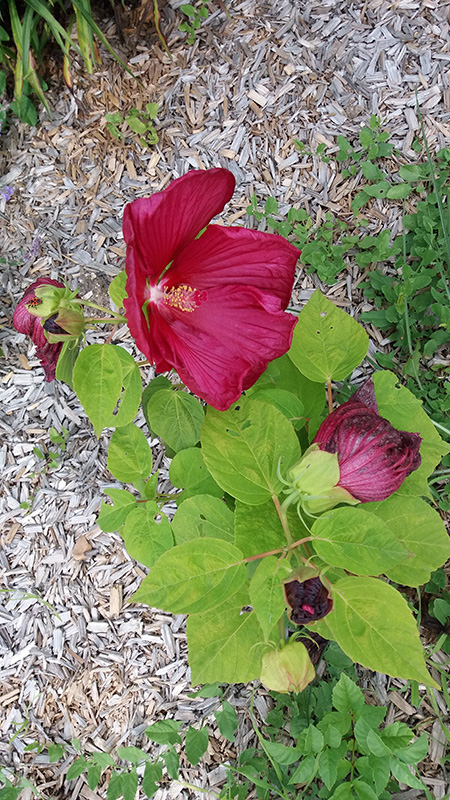 Description de cette plante : hauteur ~30cm, tiges non ligneuses, les fleurs se ferment la nuit et s'ouvrent d'abord en forme de lobe voir la blanche puis plus franchement comme une hibiscus