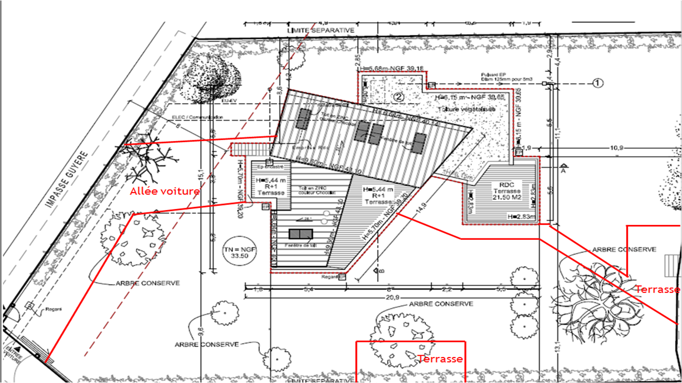 Globalement les implantations/croisements sont corrects. Peut être des détails à régler au moment de la pose, mais rien d'inquiétant. Par contre, les tranchées en bord de mur et terrasse, il faut oublier. Mieux vaut creuser à 60 cm de distance du bord et mettre un tuyau de dérivation type SP FLex.