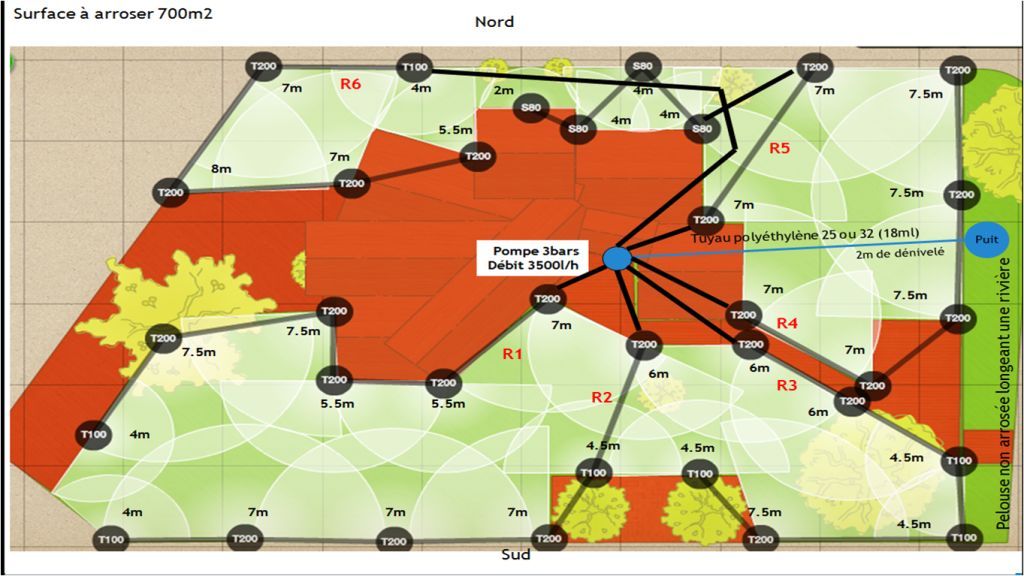C'est un peu léger au nord à droite vers R5 en terme de recouvrement., idem en bas à gauche du plan, ainsi qu'en dessous de R1 et R2. Le croisement, juste en dessous, des arroseurs T100 n'est pas bon, il en manque (un à chaque coin plus un au milieu au minimum) de façon indispensable : en les réglant à 270° vous venez alors arroser le pied des arroseurs T200 situés en limite basse.