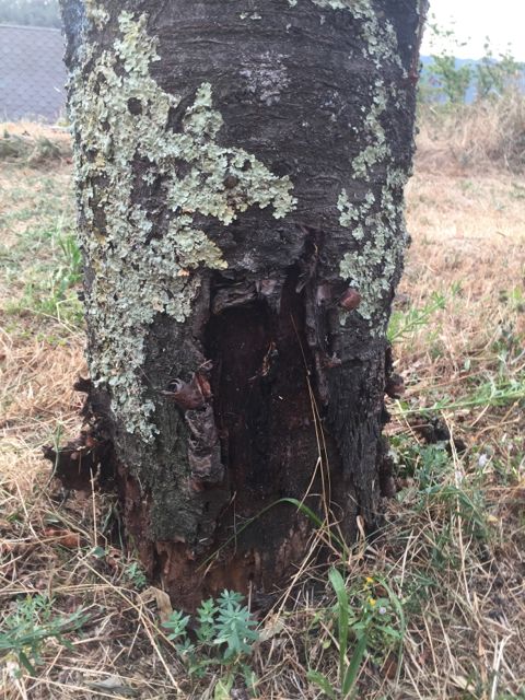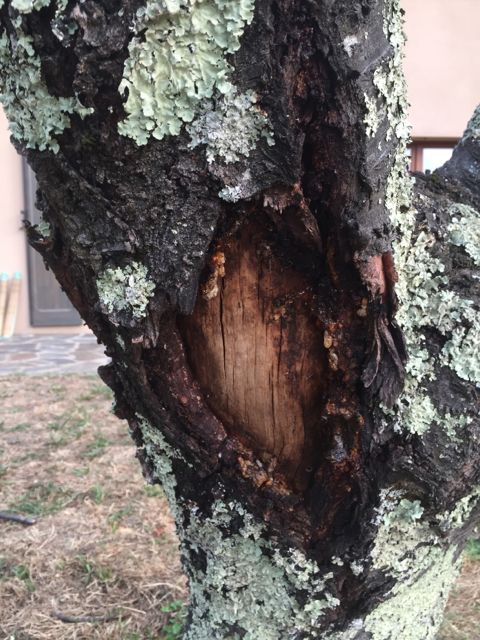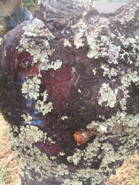 Il ne produit plus de cerise, mais garde quand même encore quelques feuilles. Il présente deux grosses entailles dans le tronc, de la sève semble sortir par endroit, et la quasi totalité de l'arbre est recouverte par un sorte de champignon....