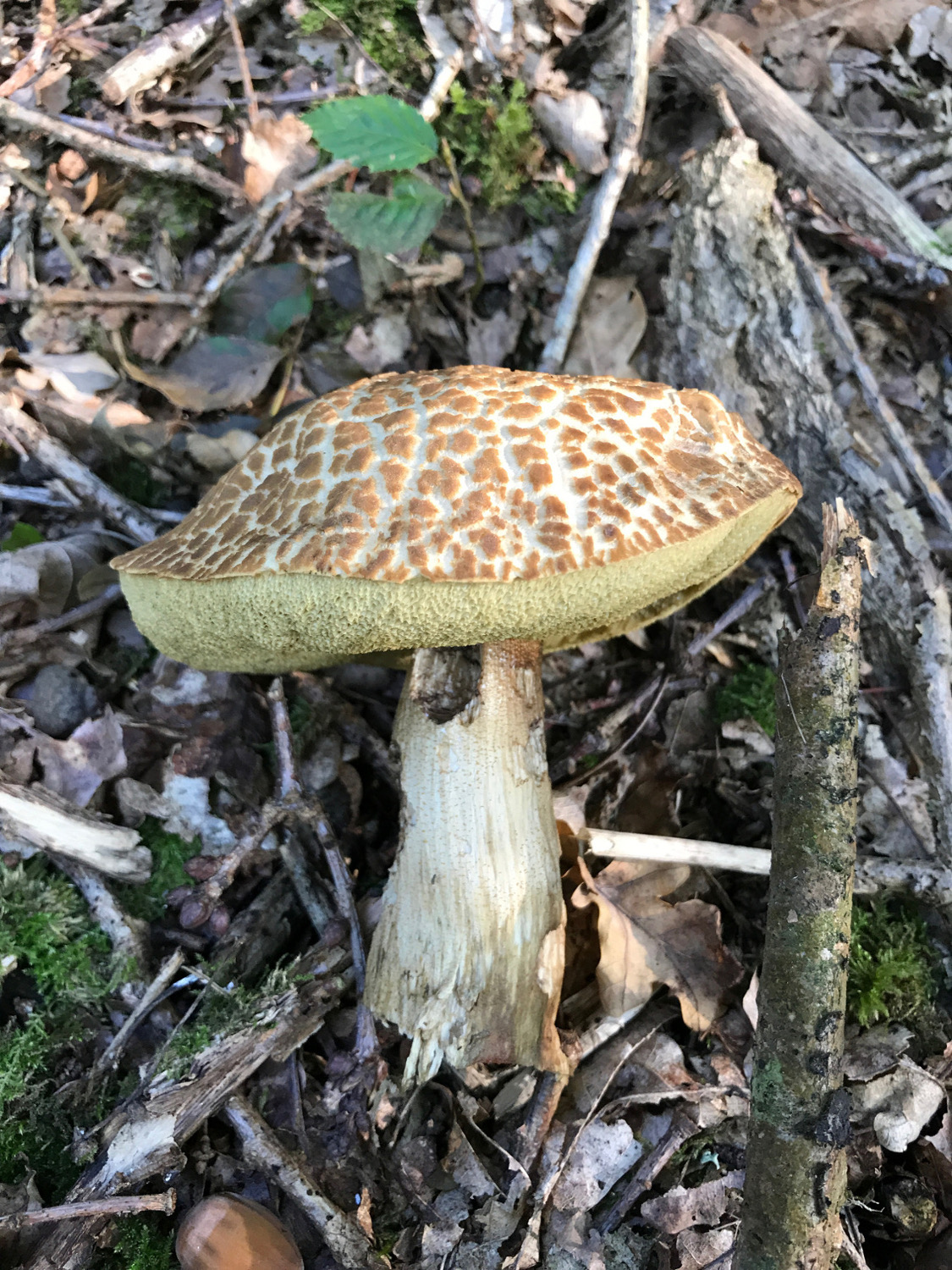 Il me semble connaître le Leccinum crocipodium mais je n'en ai jamais vu avec un tel chapeau aussi marqué. Dans cette foret, il y en a pas mal mais sont bien plus petits que celui ci .