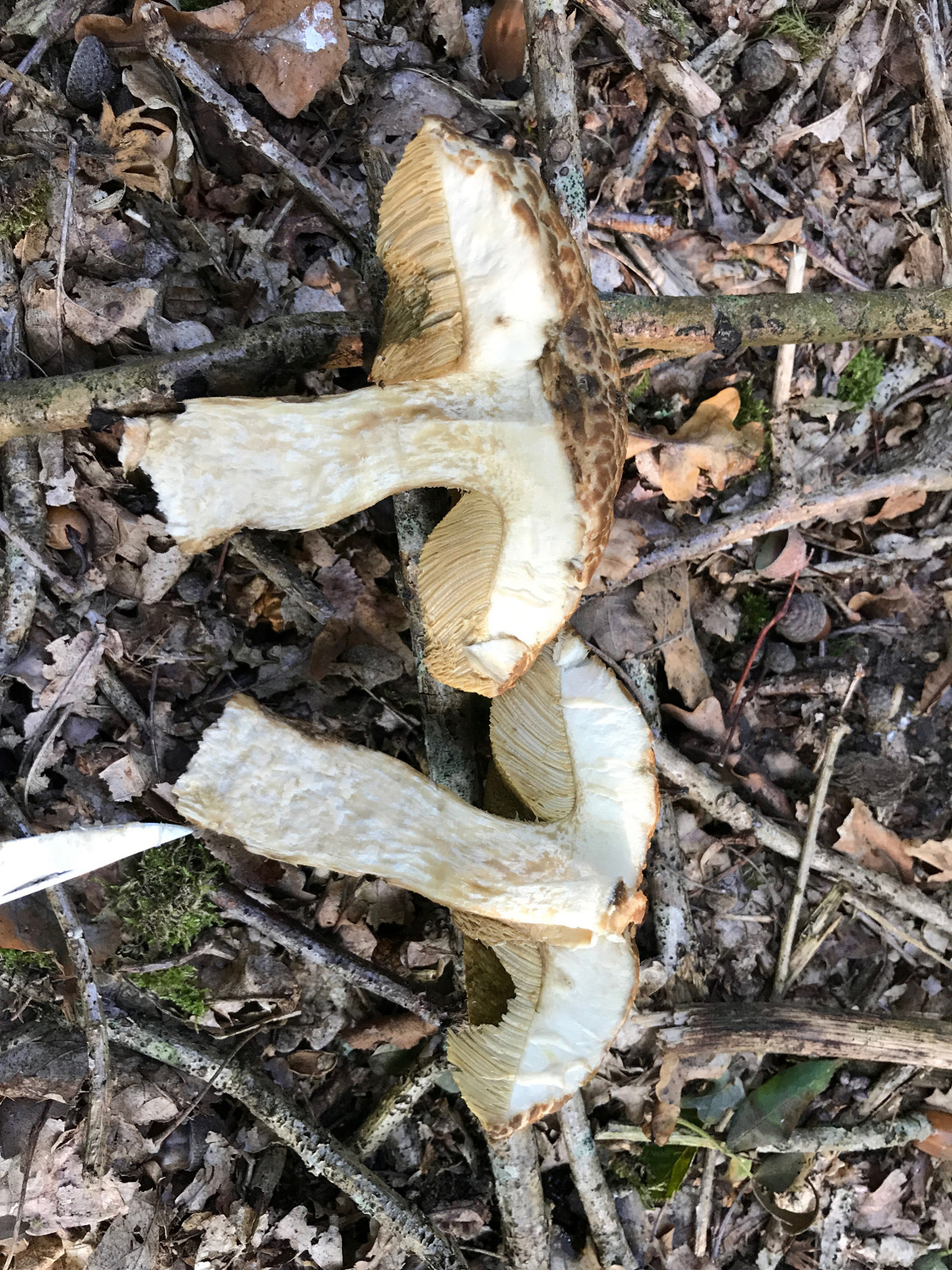 J'avais pensé à un bolet pomme de pin puis "exit" cette idée mais, de retour à la maison, en faisant une recherche avec les termes "bolet" et "squameux", je reviens sur cette idée.