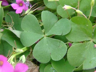 Les feuilles ont 3 folioles en forme de cœur (2 à 5 cm) très longuement pétiolées (5 à 25 cm) et les folioles vertes sont violacées en dessous.
