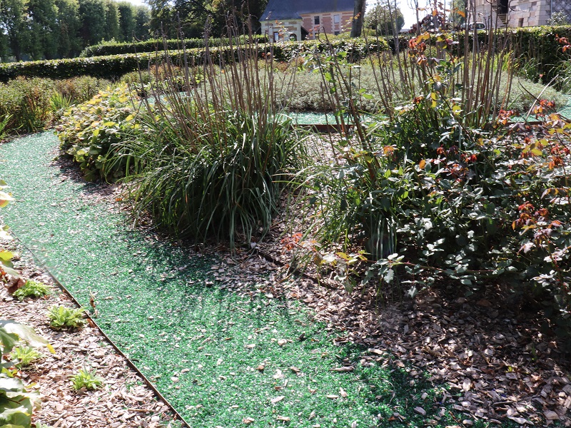 Le verre pilé est utilisé par les paysagistes. Il y a quelques années, j'en avais vu dans le potager-verger du château de La-Roche-Guyon. C'est certainement difficile à maintenir en l'état avec le temps et des arbres à proximité, par exemple pour les feuilles mortes. L'effet est magnifique mais c'est tout de même dangereux pour les petits enfants et les animaux.