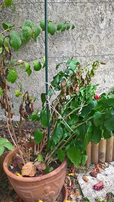 on m'a offert au début de l'été un "triple" hibiscus. Tout s'est bien passé jusqu'en septembre; Là , un des pieds a commencé à avoir ses feuilles se rabougrir, devenir noires. Etant à l'ombre, je l'ai mis au soleil. Mais petit à petit les autres pieds sont eux aussi touchés par ce problème. Voici quelques photos, si vous avez des idées pour le sauver ... Merci par avance !