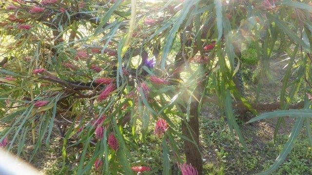 Arbre à port étalé , petite taille ( 3 m ) , à feuillage persistant , feuilles longues , dentelées, argentées dessous . Floraison en mars , fleurs rouge éclatant, petites , en grappe . ( voir photos )