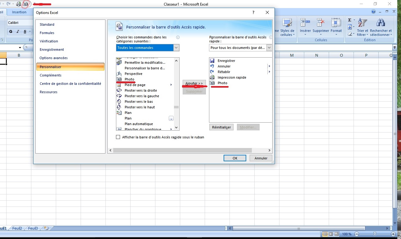 Quand je parlais de prendre une photo, je ne parlais pas d'APN, mais de l'outil "photo" inclus dans Excel ; accessible dans la barre d'accès rapide :