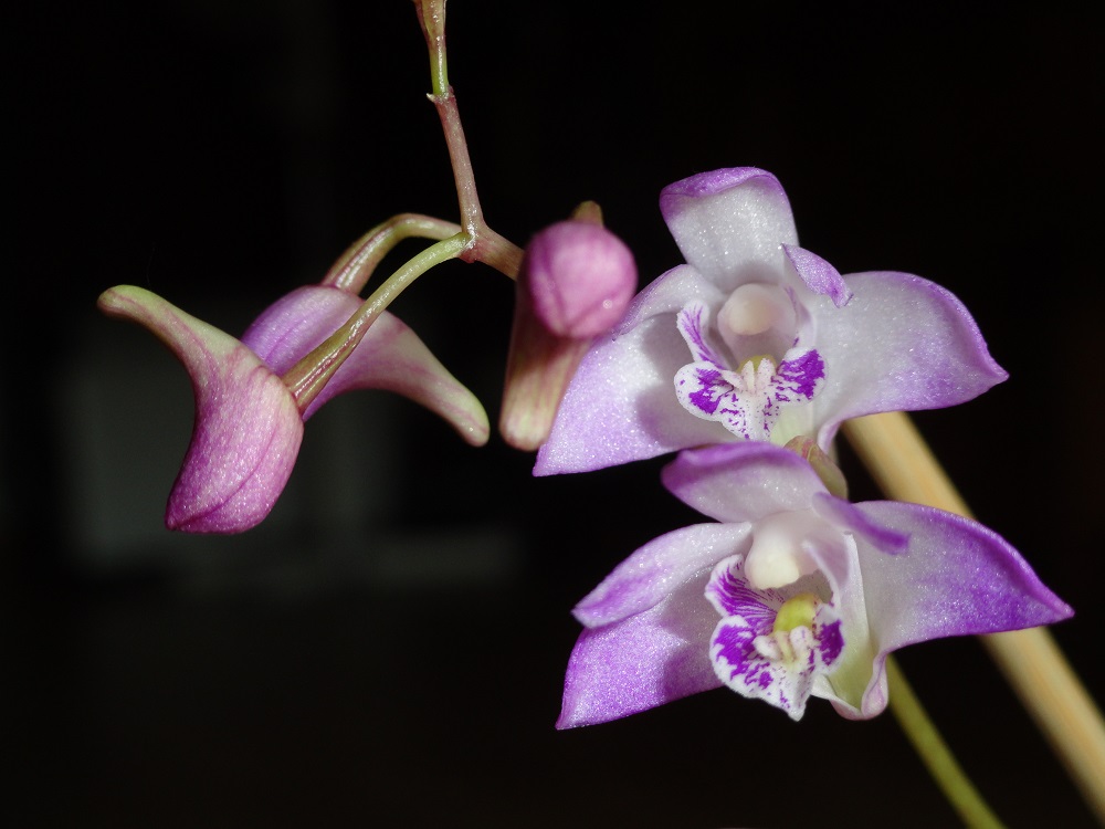 D'après les fleurs et l'aspect de la plante, il semblerait que ce soit un dendrobium kingianum. Ca explique pourquoi j'ai eu du mal à le faire fleurir car cette espèce est très gourmande en eau et engrais pendant la pousse des nouvelles cannes, mais doit passer l'automne/hiver au frais et quasi sec. Donc, je ne l'arrosais pas assez au printemps/été et un peu trop en automne/hiver